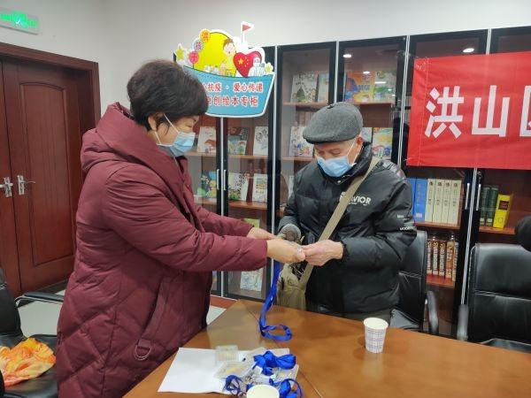 洪山区图书馆馆长周娟向老年读者代表颁发爱心读书证。记者李昕宇 摄