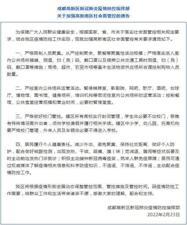 2月23日下午,成都高新区新冠肺炎疫情防控指挥部发布关于加强高新南区社会面管控的通告。要求严控室内公共场所运营活动。暂停棋牌室、影剧院、网吧、歌厅、酒吧、台球厅、博物馆、图书馆、健身场所、培训机构等密闭性室内公共场所的运营活动;控制餐馆、公共食堂经营规模和营业时间,必要时暂停堂食。