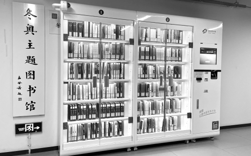 石景山区图书馆冬奥分馆的24小时微型图书馆。北京市石景山区图书馆 供图具体而言,2018年世界读书日当天,石景山区图书馆冬奥分馆就在冬奥组委办公区开馆,正式为冬奥组委提供服务。该馆面积150平方米,配置自助办证机、自助借还机、智能书架、24小时微型图书馆、电子阅读设备和数字阅读查询设备等,提供全自助智能服务。通过国家图书馆中外文献数据库、首都图书馆数据库、石景山区图书馆冬奥专题数据库,开展深层次咨询服务,更加突出“智库”的作用。