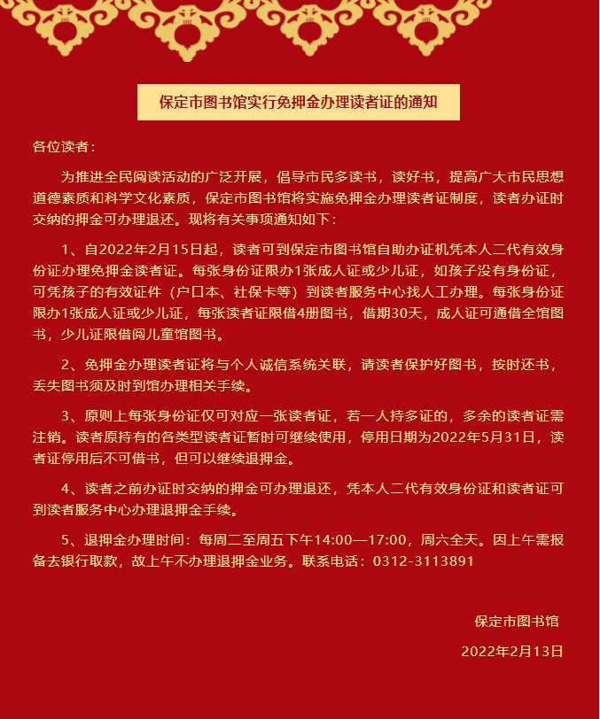 从保定市图书馆获悉,为推进全民阅读活动的广泛开展,倡导市民多读书,读好书,提高广大市民思想道德素质和科学文化素质,保定市图书馆将实施免押金办理读者证制度,读者办证时交纳的押金可办理退还。